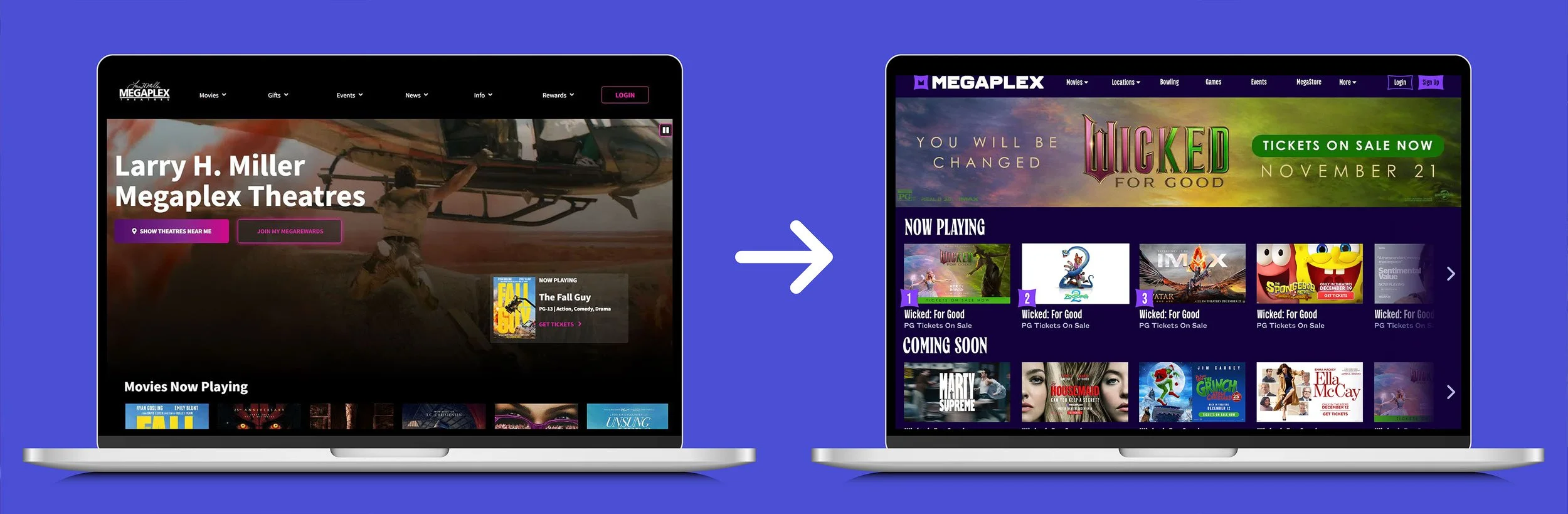 The homepage redesign gave Megaplex a digital presence worthy of the in-theater experience they deliver. The new experience is faster, cleaner, and intentionally built around how modern audiences browse and discover films.