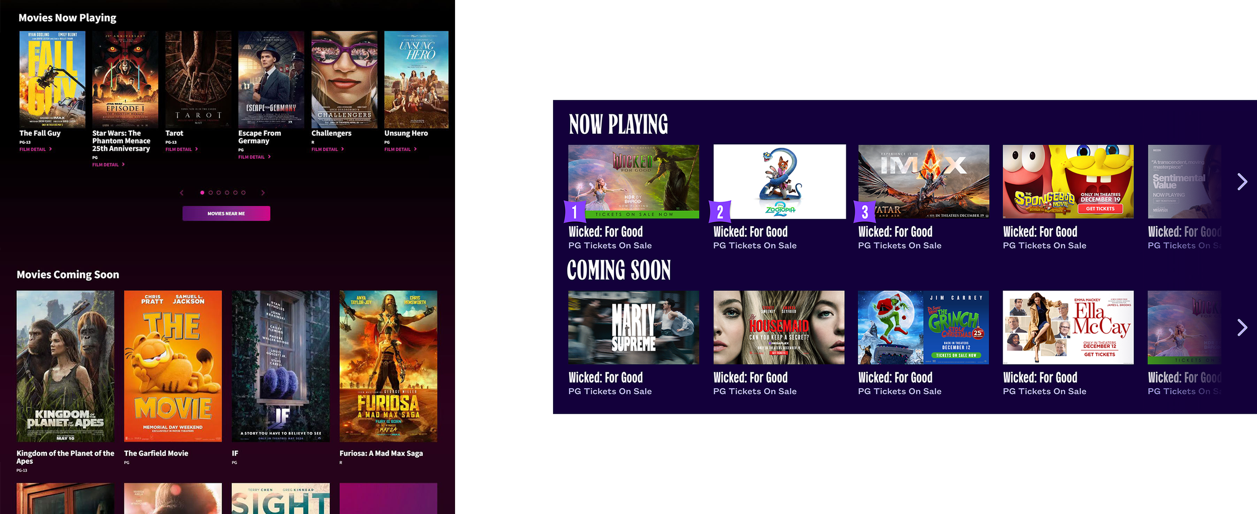 The Megaplex homepage is the front door to the entire customer journey, where first impressions are made and where users decide whether to stay or leave. We needed to modernize a clunky, outdated design, establish visual consistency, and create a seamless experience that guides customers to what they're looking for quickly.